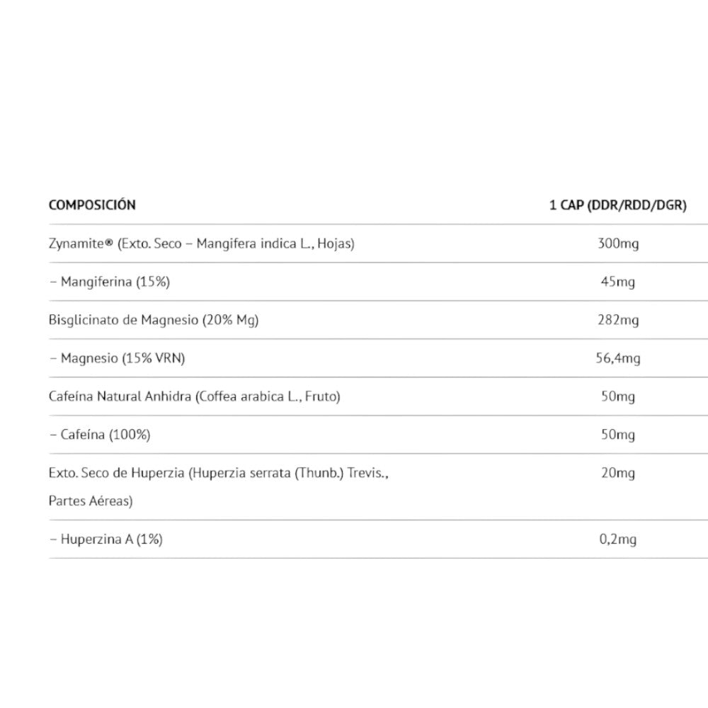 Incluye ingredientes reconocidos por su actividad nootrópica como la L-Tirosina, el Ginkgo Biloba, la Citicolina y extractos adaptógenos que contribuyen a reducir la fatiga mental y mejorar el procesamiento cognitivo. Esta combinación favorece la memoria, la atención sostenida y la capacidad de respuesta.