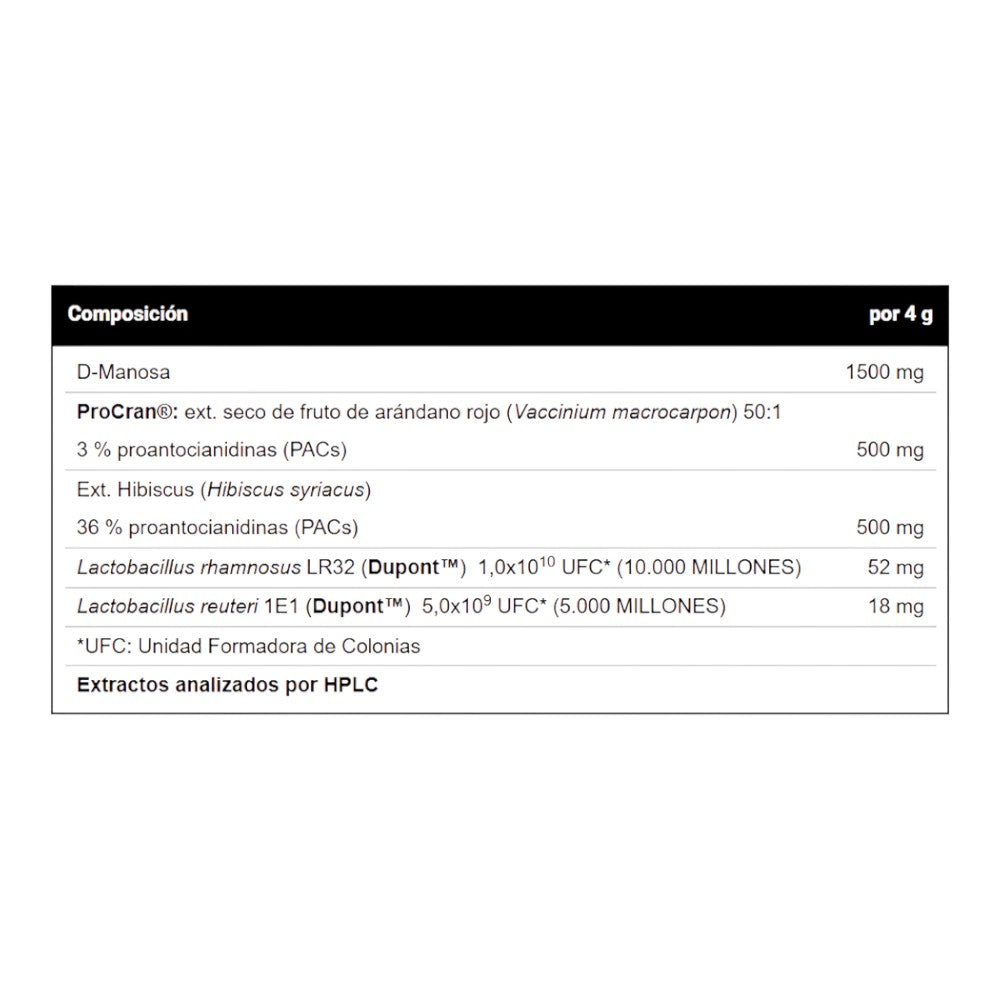 D-Manosa, edulcorante: eritritol, ProCran®: ext. seco de fruto de arándano rojo (Vaccinium macrocarpon) 50:1 (3 % proantocianidinas), ext. Hibiscus (Hibiscus syriacus) (36 % proantocianidinas), antiaglomerante: dióxido de silicio, Lactobacillus rhamnosus LR32 y Lactobacillus reuteri 1E1.