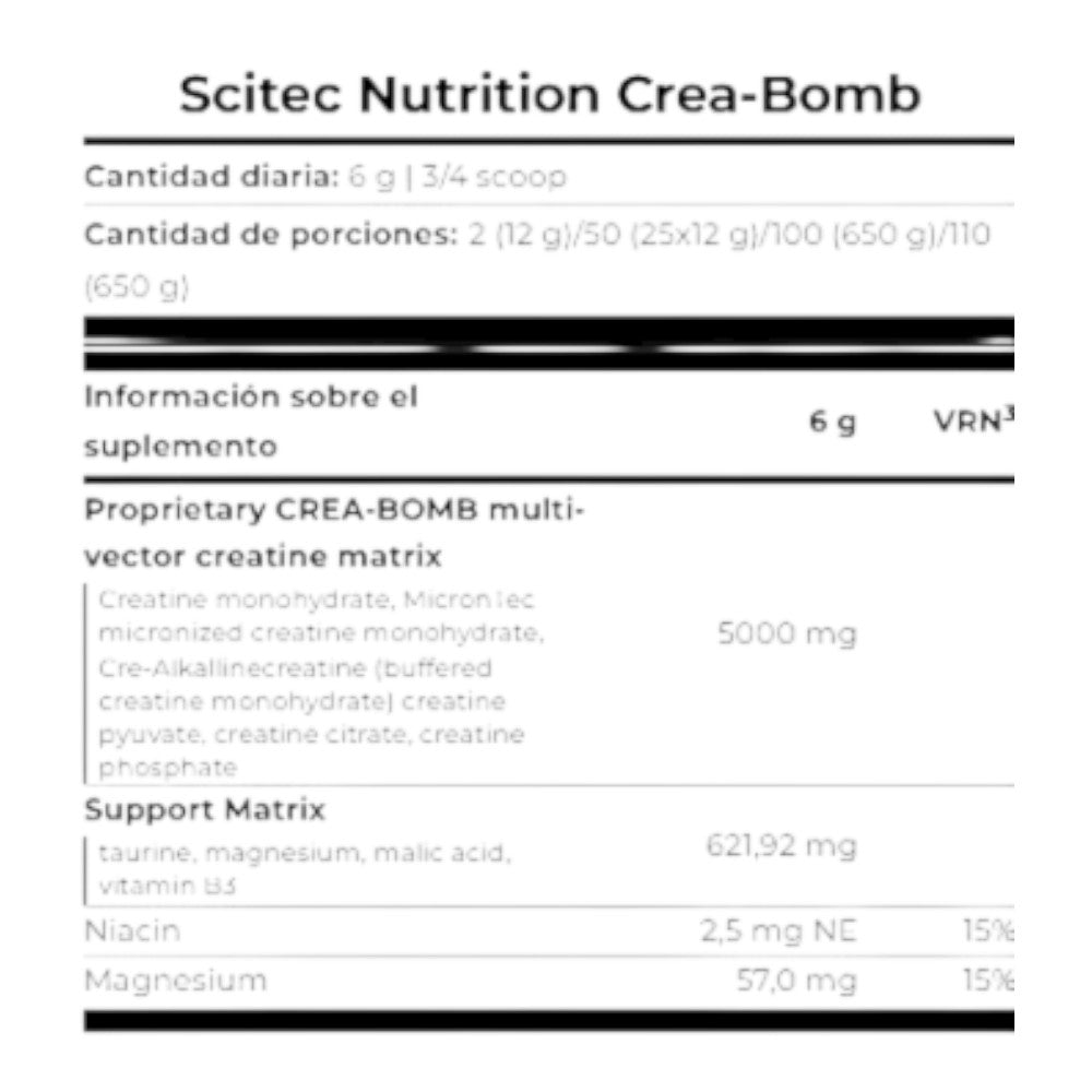 Crea-Bomb es la nueva matriz de creatinas de Scitec Nutrition en forma de polvo con una "doble acción", ya que por un lado la creatina esta unida químicamente con otras sustancias que le proporcionan una funcionalidad superior a la creatina ordinaria, además del propio efecto ergogénico (mejora del rendimiento) que produce la utilización de la creatina.