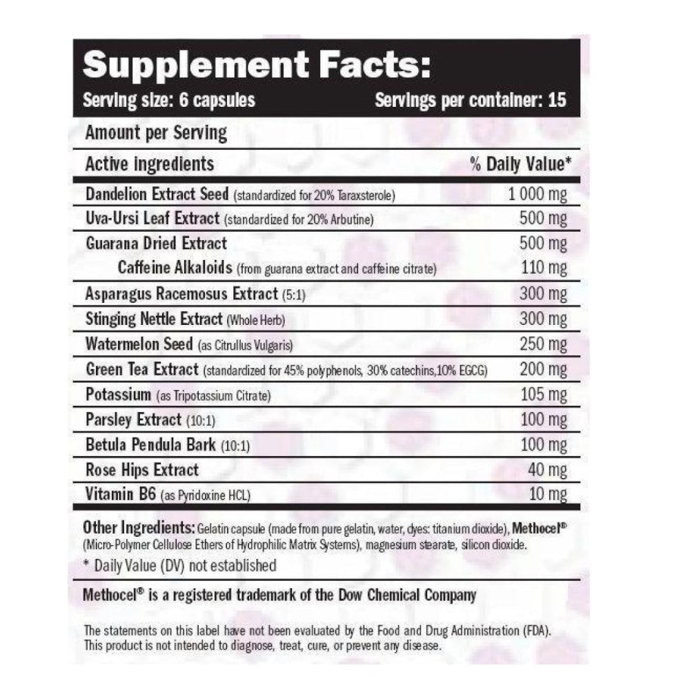 Extracto de semilla de diente de león, cápsula de gelatina (A base de gelatina pura, agua, colorantes: Dióxido de titanio), extracto de uva ursi, extracto seco de guaraná, cafeína alcaloide, extracto de esparrago, extracto de ortiga, extracto de semilla de sandia, extracto de té verde, potasio (Citrato tripotásico), extracto de perejil, corteza de abedul blanco, escaramujo, methocel (Micro-polímero hidrofílico éteres de celulosa de sistemas de matriz), vitamina B6 (Piridoxina HCL), estearato de magnesio, dióxido de sicilio.