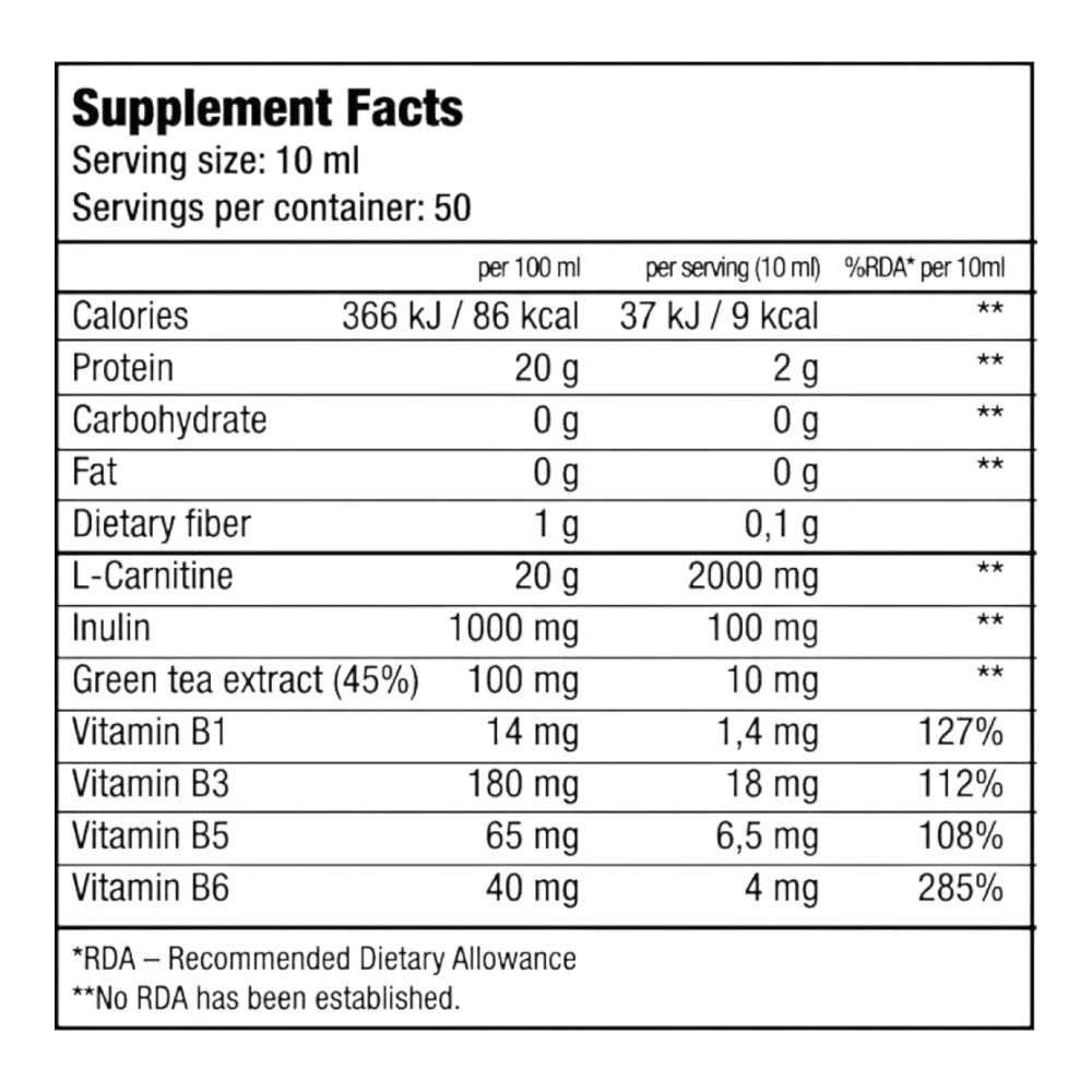 Liquid L-Carnitine 100.000 está enriquecido con importantes vitaminas e inulina para mantener la absorción de L-Carnitina en el cuerpo.