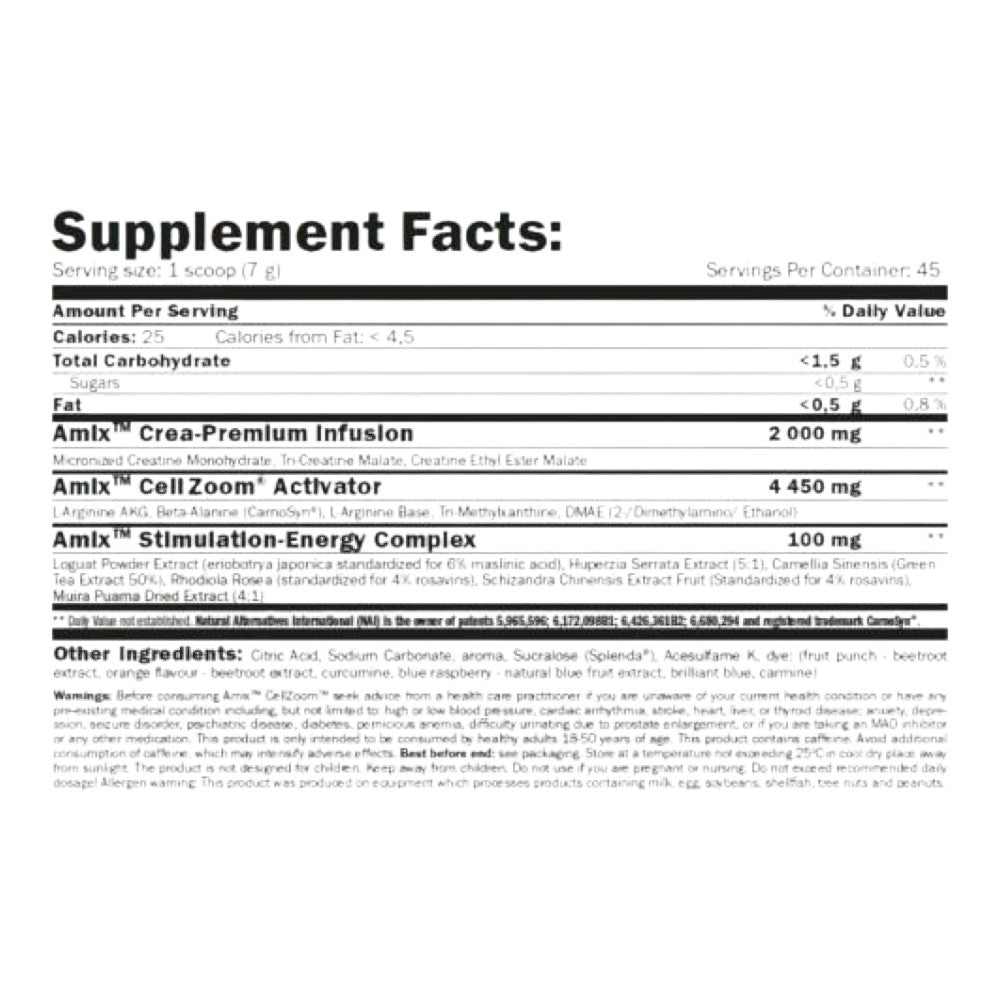 Contiene monohidrato de Creatina micronizada, Tri-Creatina Malate y Creatine Ethyl Ester Malate. Esta mezcla única nos proporciona una gran fuente de energía que aumenta la fuerza y resistencia de forma notable, aumentado de forma drástica la congestión muscular, produciendo así masa muscular libre de grasa. Promueve la hidratación de las células, incrementando la energía explosiva y aumentando la fuerza máxima. Su optima formula proporciona una rápida recuperación de las fibras musculares tras un entrenamiento intenso.