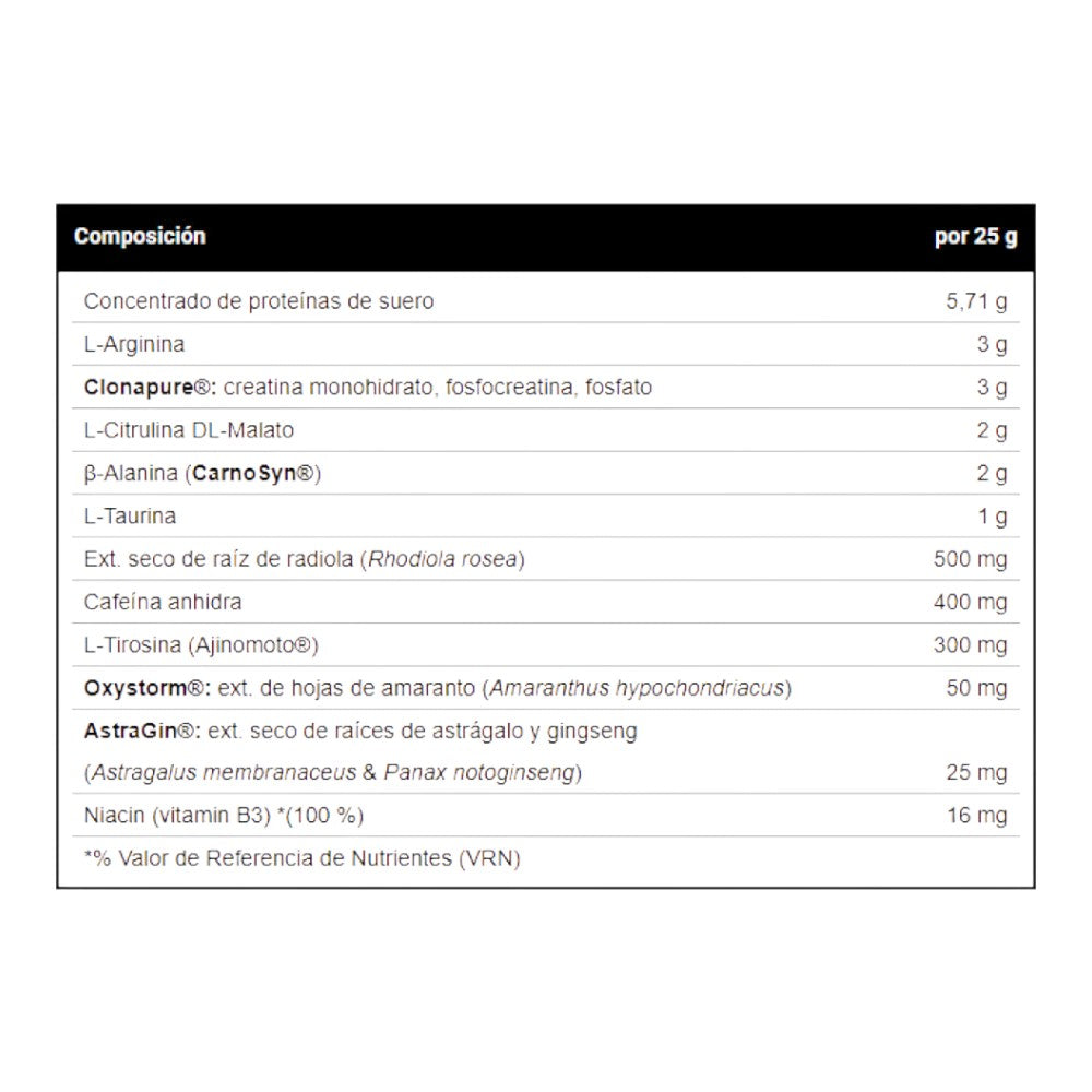 - Energía y Enfoque: Contiene estimulantes (como la cafeína) y nootrópicos para aumentar el estado de alerta y la conexión mente-músculo.