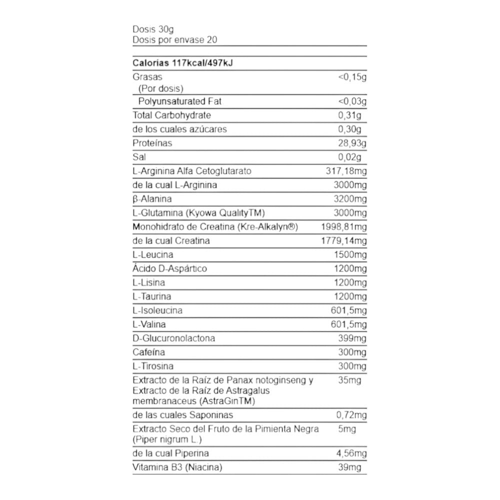 L-Citrulina Malato, Beta-Alanina, Creatina Monohidrato, Dextrosa, L-Arginina, Cafeína Anhidra, Taurina, N-Acetil L-Tirosina, Vitamina B6 (Piridoxina Clorhidrato), Ácido Cítrico, Aromas, Colorantes, Edulcorante (Sucralosa).