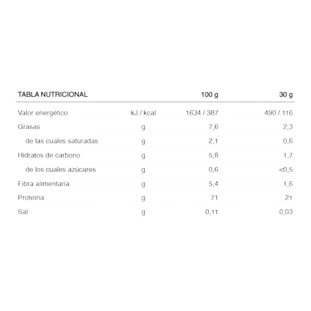 Se trata de un producto apto para veganos con un 70% de proteína, aportando 21g de proteína por toma. Con poco más de 100 kcal, bajo en grasa y sin azúcares añadidos ya que está endulzado con stevia. Su aporte total de azúcar por toma es menor de 0,5 g, por lo que es perfecto para tomar a cualquier hora del día y aumentar la ingesta de proteínas vegetales de manera saludable.