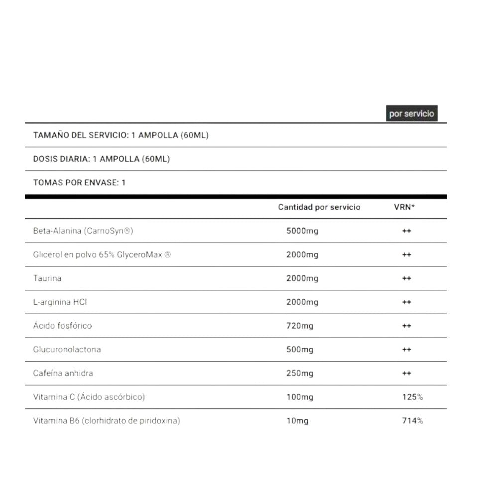 Formato monodosis en botella de fácil consumo. Con cafeína (dosis elevada). No recomendado para personas sensibles a los estimulantes. Conservar en lugar fresco y seco.