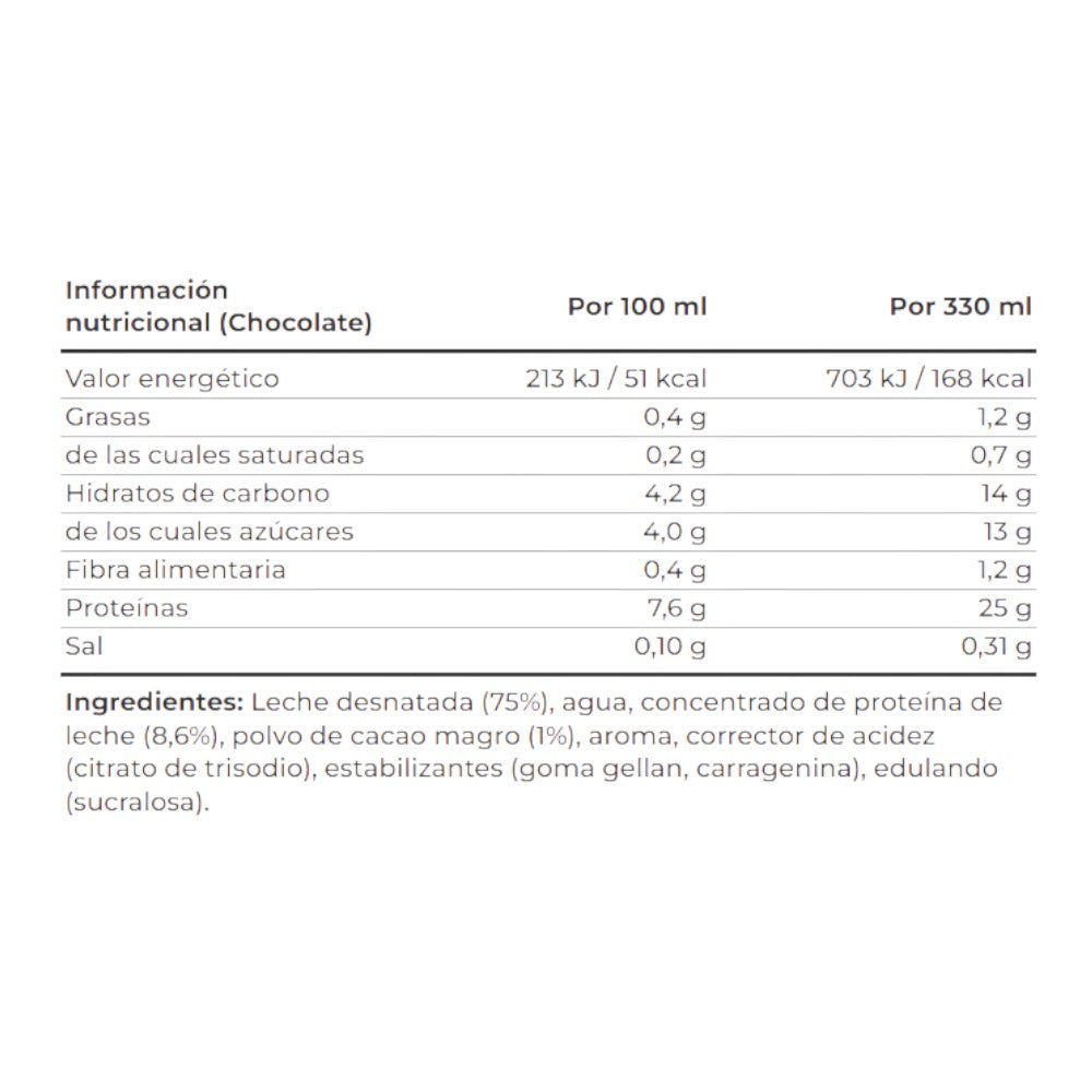 Ingredientes: Leche desnatada (77 %), agua, concentrado de proteína de LECHE (6 %), aromas, estabilizadores (goma gellan, carragenanos), corrector de acidez (citrato de trisodio), colorante (curcumina), edulcorante (sucralosa).