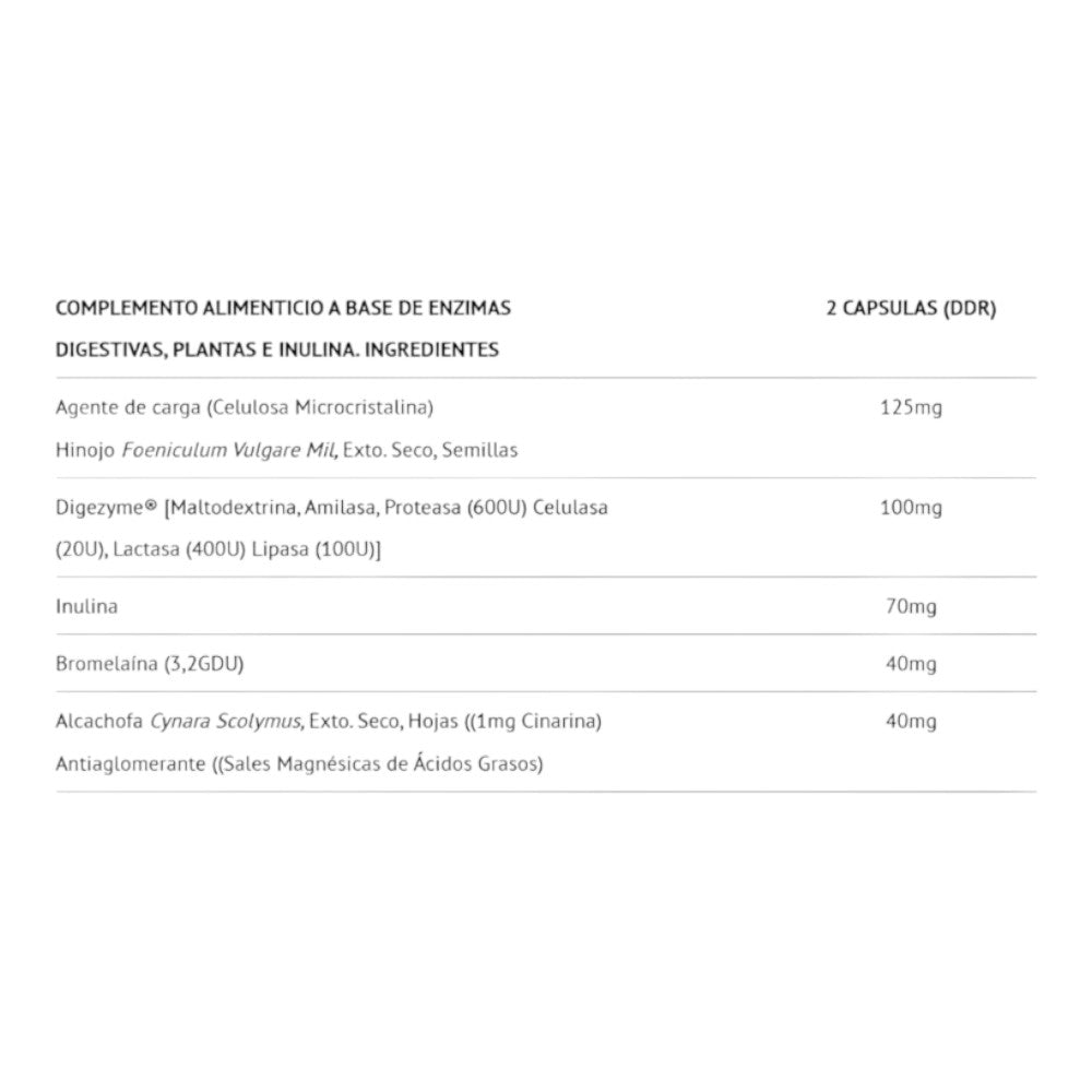Agente de Carga (Celulosa Microcristalina), Cápsula, Hinojo (Exto. Seco, Semilla), Digezyme®, Agente de Carga (Maltodextrina), Inulina, Bromelina (Exto. Seco, Tallo), Alcachofa (Exto. Seco, Hojas) y Antiaglomerante (Estearato de Magnesio).