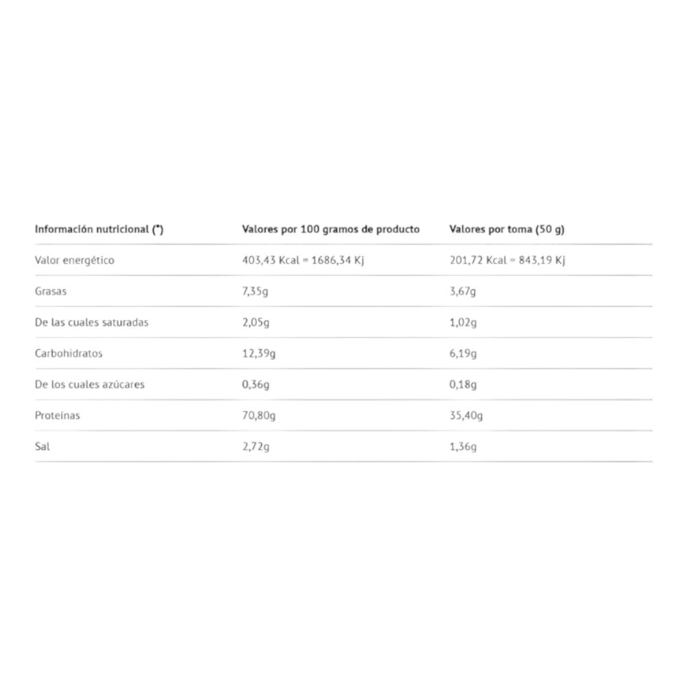 Proteína de Guisante 85% (63%), Proteína de Arroz 80% (20%), Maltodextrina (6,56%), Cacao Natural en Polvo (4%), Aromas (2,60%), Harina de Quinoa, (Chenopodium Quinoa) (1,25%), Semilla de Lino en Polvo (Linux Usitatisimum, Semillas) (1,25%), Cloruro de Sodio (0,50%), Mijo (Panicum Miliaceum, Exto. Seco, Semilla) (0,25%), Greens & Fruits (Exto. Seco) [Pimiento (Capsicum Annuum), Jengibre (Zingiber Officinale), Brócoli (Brassica Oleracea Itálica), Espinacas (Spinacia Oleracea), Col Rizada (Brassica Oleracea Var. Capitata), Col (Brassica Oleracea), Té Verde (Camellia Sinensis), Frambuesa (Rubus Ídaeus), Plátano (M. Paradisiaca L.), Kiwi (Actinidia Deliciosa), Mango (Mangifera Indica), Ciruela (Prunus Doméstica), Lima (Citrus Aurantifolia), Arándano (Vaccinium Myrtillus), Piña (Ananas Comosus), Naranja (Citrus Sinensis), Rosa Pomelo (Citrus Paradisi), Cereza (Prunus Cerasus), Limón (Citrus Limon), Coliflor (Brassica Oleracea Var. Botrytis), Hierba de Trigo (Triticum Aestivum), Alfalfa (Medicago Sativa), Spirulina, Chlorella] (0,25%), Edulcorante (Sucralosa), Complejo Multienzimático Digezyme® (Maltodextrina, Amilasa, Lipasa, Lactasa, Celulasa y Proteasa) y Edulcorante (Glucósidos de Steviol).