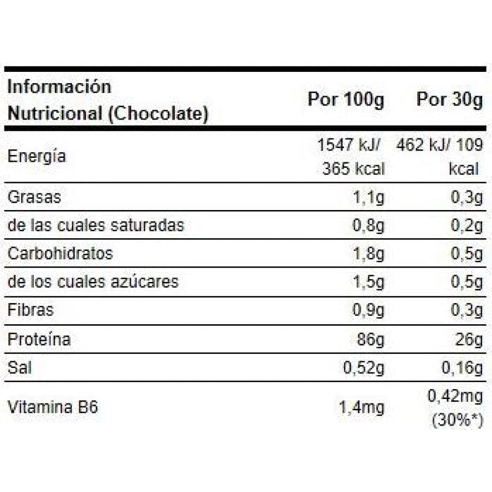 Aislado de proteína de suero de leche ((Volactive® Ultra Whey XP) ultrafiltrado y microfiltrado de flujo cruzado (leche) (emulsionante: lecitina de soja); polvo de cacao bajo en grasa; sabores; bromelina 2400 GDU (30mg/dosis diaria); edulcorante: sucralosa; vitamina B6 (clorhidrato de piridoxina).