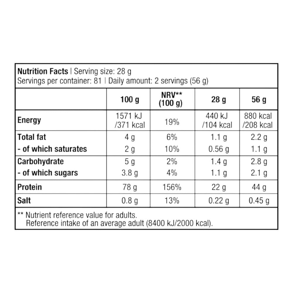 Su fórmula contiene una mezcla de concentrado y aislado de suero de leche enriquecido con una matriz de aminoácidos (glutamina, BCAAs y arginina), todo ello con una calidad y pureza máximas.