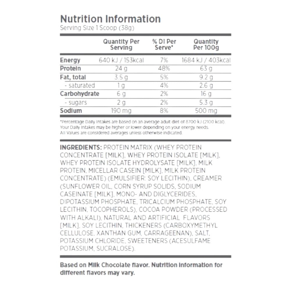Mezcla de proteínas (concentrado de proteína de suero, aislado de proteína de suero, aislado de proteína de suero hidrolizada, concentrado de proteína de leche, caseína micelar, caseinato de calcio, emulsionante: lecitina de soja), aceite de girasol en polvo, cacao magro en polvo (7%), aromas, espesante (goma de celulosa, goma xantana, carragenano), cloruro de sodio, edulcorantes (sucralosa, acesulfamo K).