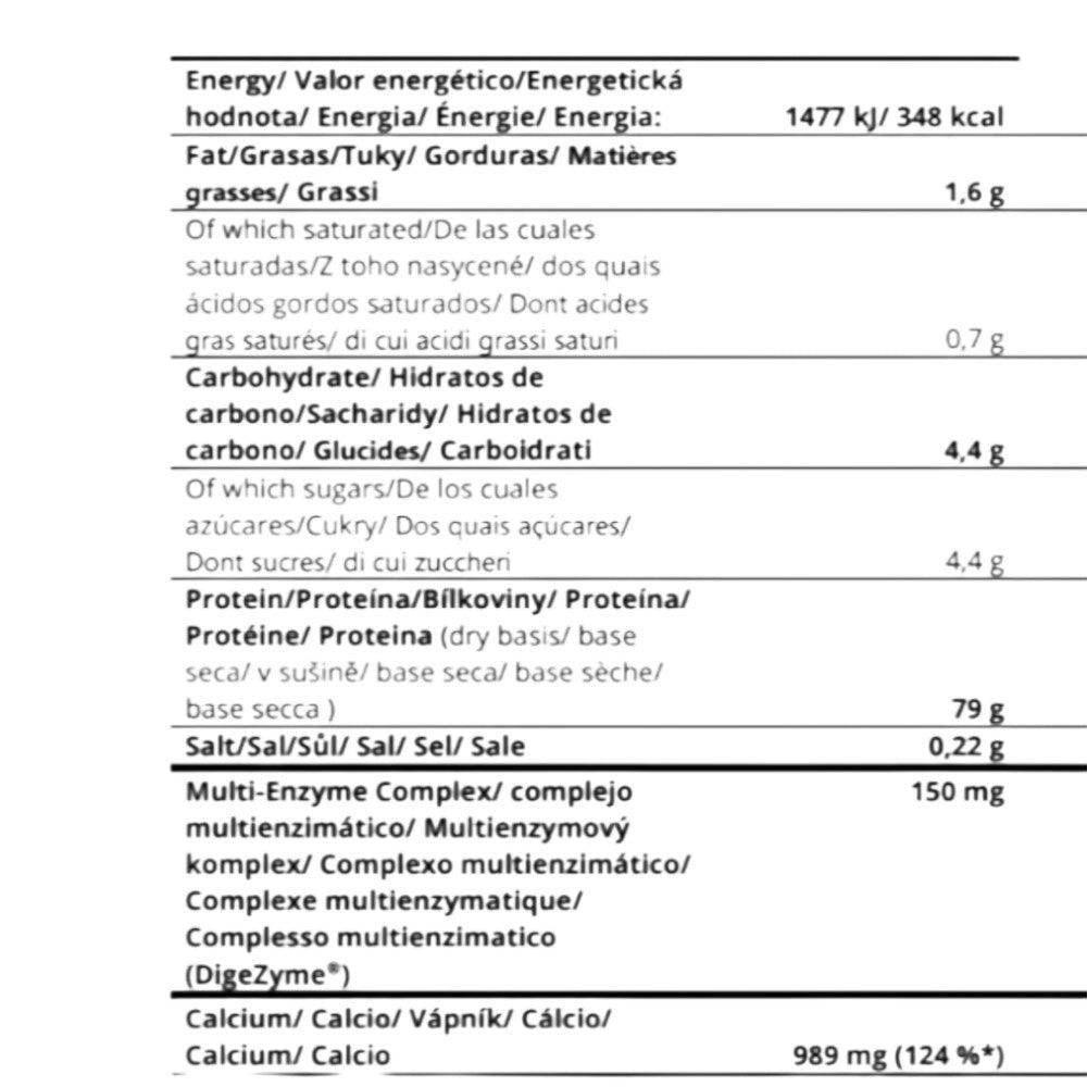 Concentrado de caseína micelar, cacao, aroma, sal, emulgente: lecitina de soja; estabilizante: carboximetilcelulosa sódica; edulcorantes: sucralosa y glucósidos de esteviol; enzima digestiva patentada DigeZyme® - complejo multienzimático (amilasa, lactasa, celulasa, proteasa neutra bacteriana y lipasa).