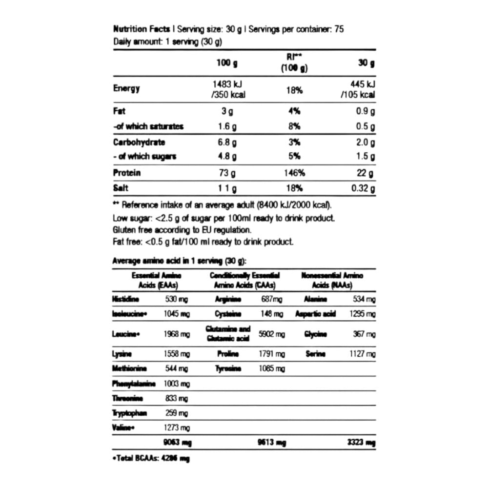 Cada servicio de 30 gramos de Micellar Casein nos aporta 22 gramos de proteína con solo 2 gramos de carbohidratos y menos de 1 gramo de grasa. Además, contiene de forma natural 4.286 mg de BCAAs y ha sido enriquecida con un 5% de glutamina.