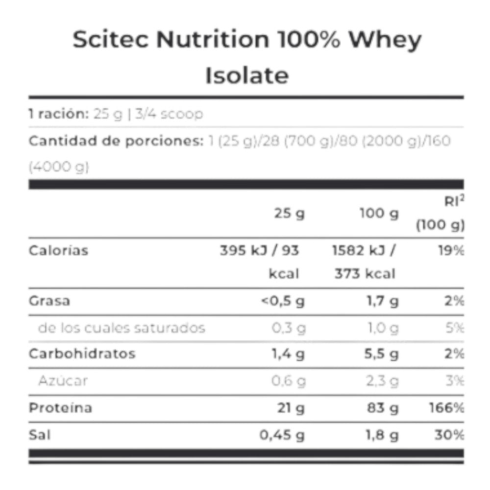 La fórmula de proteínas 100% Whey Isolate de scitec nutrition tiene  un bajo contenido en lactosa así como de carbohidratos, además contiene la fórmula "Amino Shuttle 1" que incluye glutamina, aminoácido abundante en el tejido muscular con gran importancia y múltiples funciones. Es una proteína muy cómoda que se disuelve inmediatamente de tal modo que no es necesario utilizar el mezclador o la batidora. Las proteínas aisladas de suero son buenas tanto para aumentar la masa muscular por su alto valor biológico como para en épocas de definición por su bajo contenido de carbohidratos.