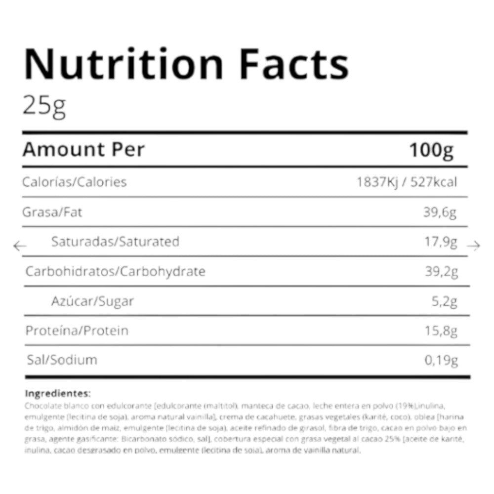 Chocolate con leche y edulcorante [edulcorante (maltitol), manteca de cacao, leche entera en polvo (17%), pasta de cacao, emulgente (lecitina de soja), aroma natural vainilla], crema de cacahuete, grasas vegetales (karité, coco), oblea [harina de trigo, almidón de maíz, emulgente (lecitina de soja), aceite refinado de girasol, fibra de trigo, cacao en polvo bajo en grasa, agente gasificante: Bicarbonato sódico, sal], cobertura especial con grasa vegetal al cacao 25% [aceite de karité, inulina, cacao desgrasado en polvo, emulgente (lecitina de soja), aroma de vainilla natural].