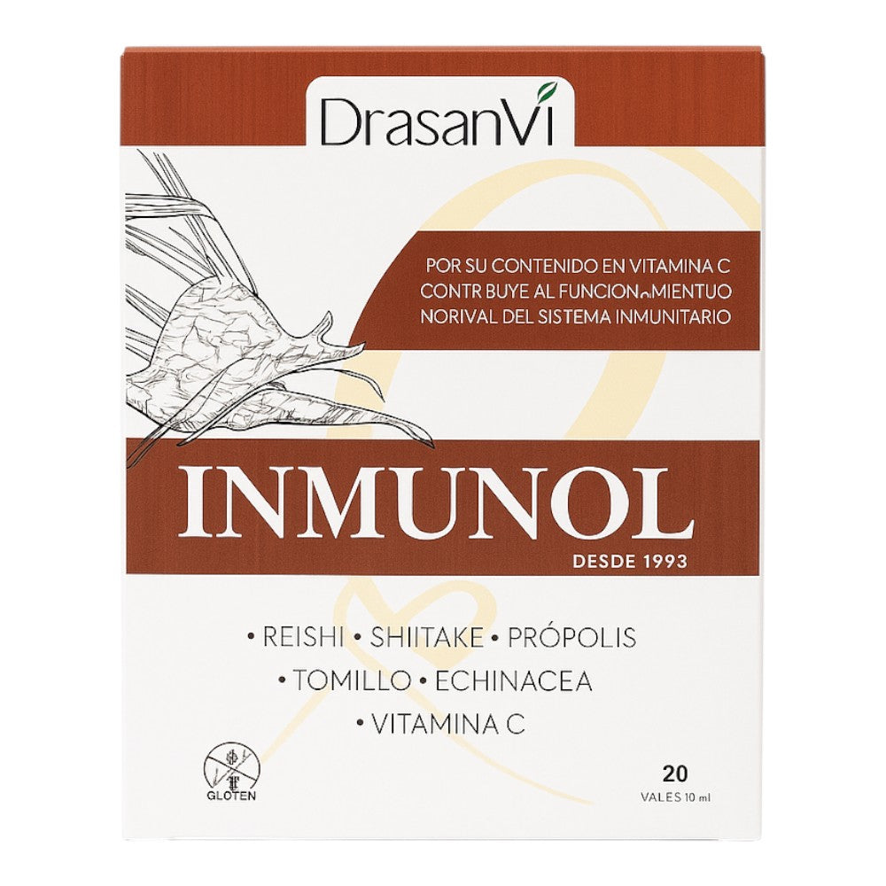 Inmunol de Drasanvi es un complemento alimenticio formulado con hongos de utilización milenaria llamados Reishi y Shiitake; minerales como el Cobre y el Selenio; Tomillo, Equinácea, Própolis; y Vitamina C, que contribuye al mantenimiento del sistema inmunitario en condiciones normales.