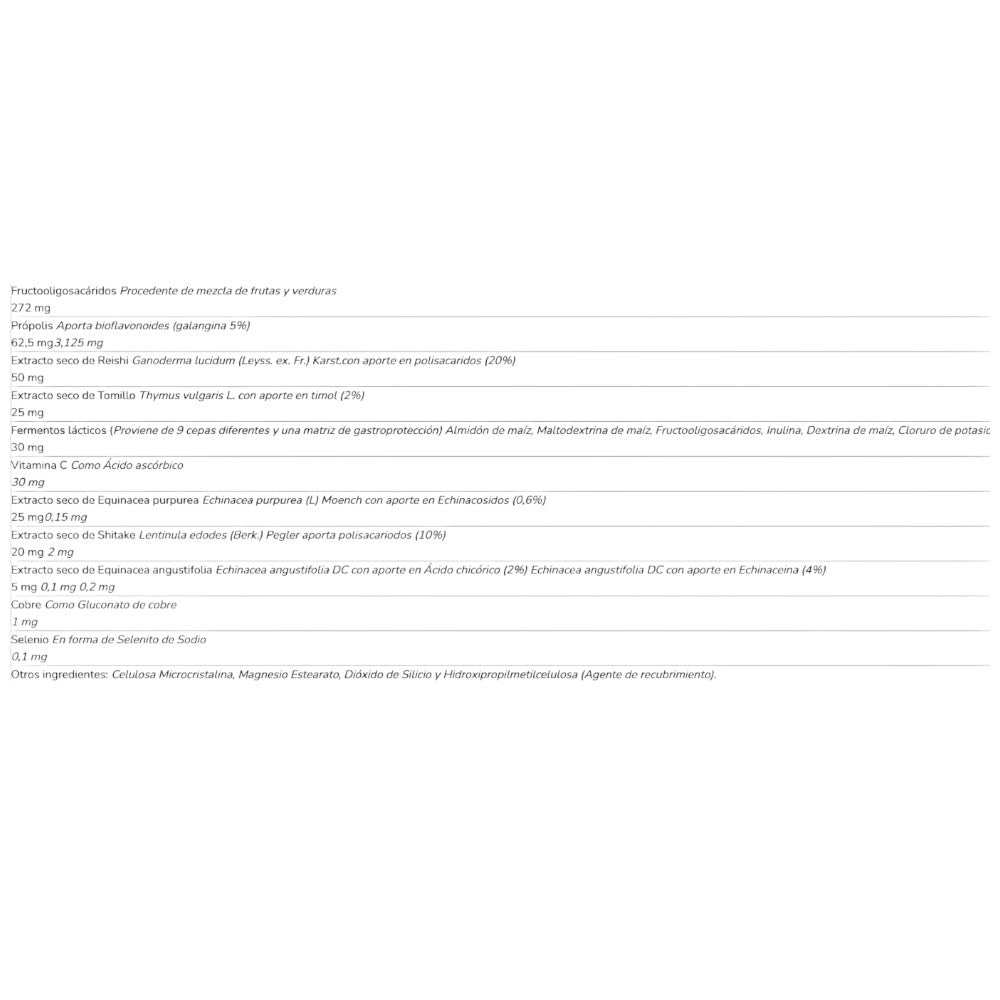 Agua , Extracto seco Própolis(galangina 5%)400 mg, Extracto seco Echinácea purpúrea(Raíz) (Echinacea purpurea (L) Moench, Echinacósidos 0,6%)300 mg, Extracto seco Reishi(Cuerpos fructíferos) (Ganoderma lucidum (Leyss. ex. Fr.) Karst, Polisacáridos 20%)100 mg, Extracto fluido Tomillo(Hoja) (Thymus vulgaris L)100 mg, Vitamina C(Ácido Ascórbico)60 mg, Extracto seco de Shitake(Micelios y carpóforos) (Lentinula edodes (Berk.) Pegler, Polifenoles 15%)40 mg, Acidulante(Ácido cítrico), Conservador(Sorbato potásico), Aroma (Aroma Limón), Levadura de selenio(Selenio 0,21%)13 mg, Gluconato de cobre(Cobre 14,28%)3,5 mg, Edulcorante(Sucralosa)