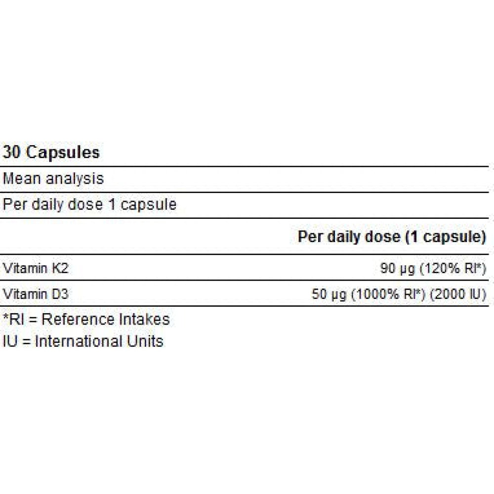 Agente de carga: Celulosa; Cápsula vegetal (Agente de glaseado: Hidroxipropilmetilcelulosa), MenaQ7 Menaquinona (Vitamina K), Colecalciferol (Vitamina D), Agentes antiaglomerantes: Sales magnésicas de ácidos grasos, Dióxido de silicio.