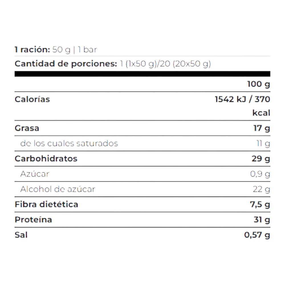 Cobertura de chocolate con leche (Edulcorante: Maltitol, Manteca de Cacao, Leche Entera en Polvo, Pasta de Cacao, Emulgente: Lecitinas de Soja, Aroma), Proteína de Leche, Colágeno Hidrolizado, Humectante (Glicerina), Aislado de Proteína de Soja, Agua, Aceite de Palma, Aroma, Edulcorante (Sucralosa).