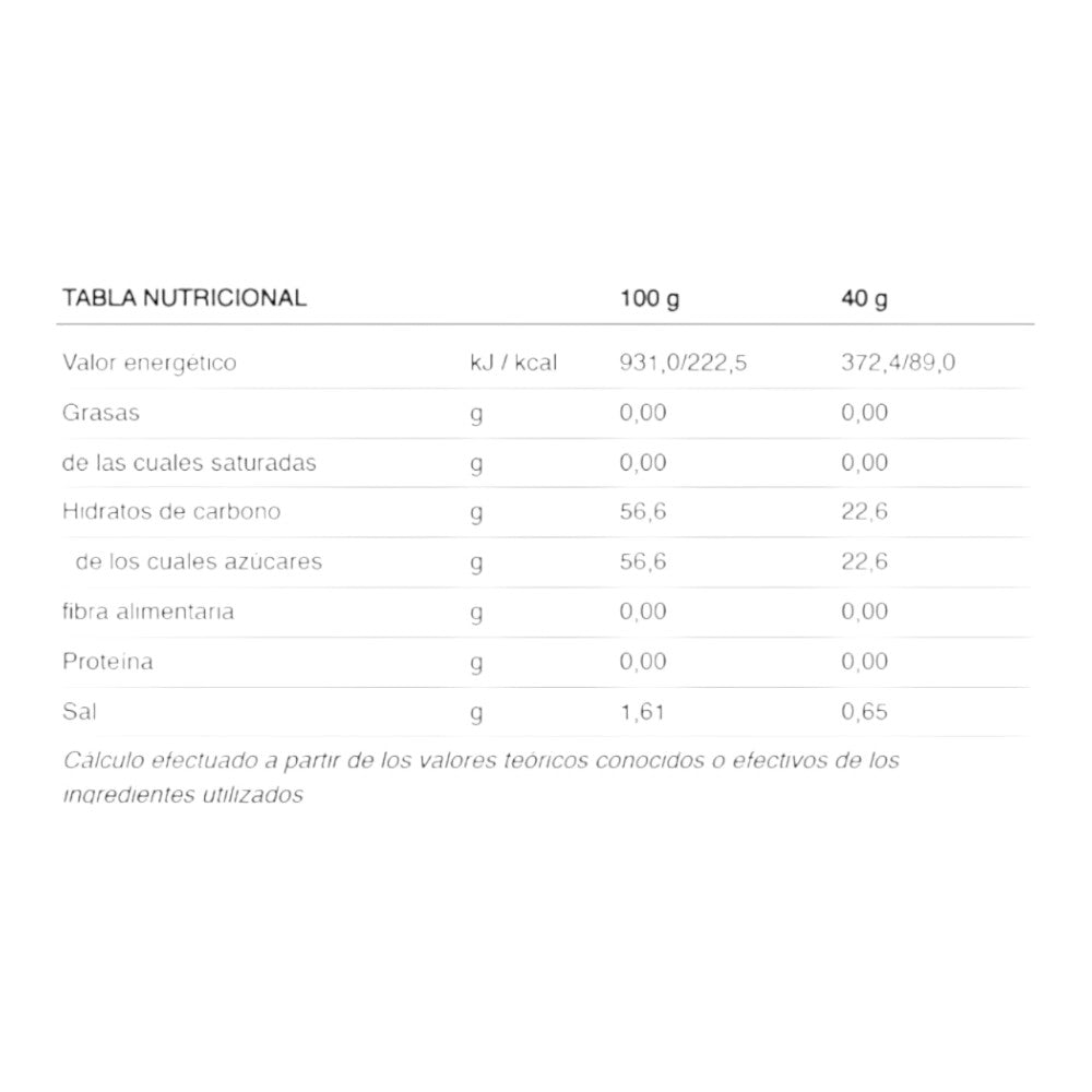 Agua, azúcar, fructosa, glucosa, sal, pectina y pectina amidada,aroma, conservadores: ácido ascórbico y sorbato potásico, corrector de acidez: ácido cítrico.