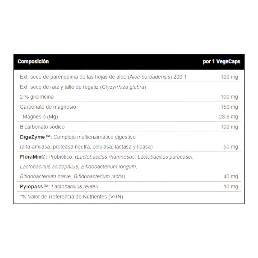 Extracto seco de aloe vera, estracto seco de regaliz desglicirrizado (DGL), carbonato de magnesio, sodio hidrogenocarbonato, Digezyme® (complejo multienzimático de origen vegetal: amilasa, proteasa, beta-D-galactosidasa, lipasa, celulasa), Floramix (probiótico mezcla de 6 cepas: Bifidobacterium lactis, Bifidobacterium breve, Bifidobacterium longum, Lactobacillus Paracasei, Lactobacillus rhamnosus (2 cepas)), Pilopass™ (lactobacilus reuteri), antiaglomerante: estearato de magnesio, agente desecante: dióxido de silicio y agente de recubrimiento: gelatina.