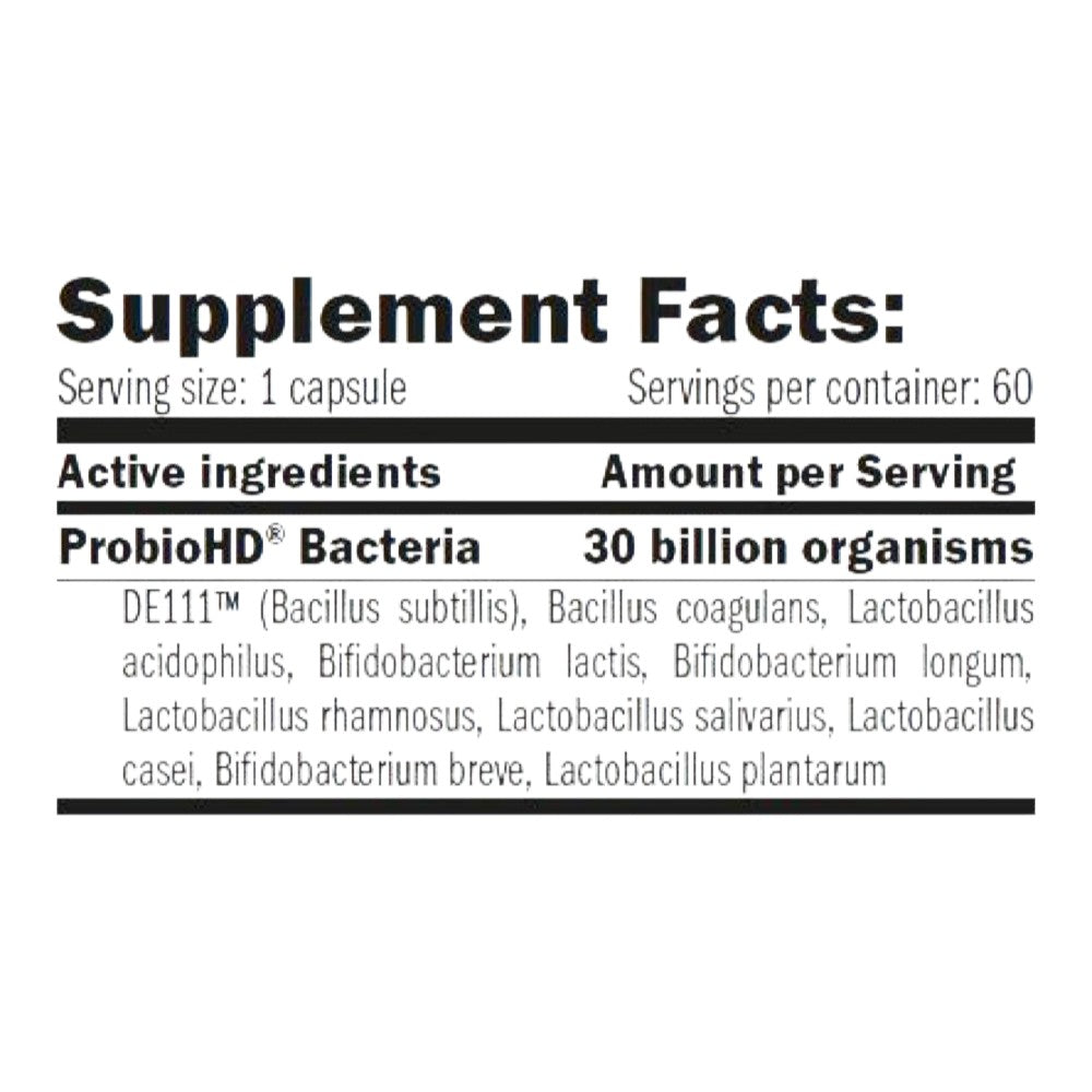Probióticos (DE111™, Bacillus subtillis, Bacillus coagulans, Lactobacillus acidophilus, Bifidobacterium lactis, Bifidobacterium longum, Lactobacillus rhamnosus, Lactobacillus salivarius, Lactobasillus casei, Bifidobacterium breve, Lactobacillus plantarum); celulosa vegetal (TRcaps®); estabilzante: dextrina de arroz con baja humedad, antiaglomerante: trigliceridos de cadena media.