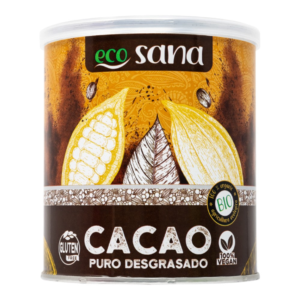 El cacao puro de ECOSANA es desgrasado y 100% natural. Destaca por su bajo contenido en materia grasa (10-12%) frente al cacao en polvo tradicional y no contiene azúcares añadidos. Se trata de un producto ecológico que ha sido elaborado con cacao de primera calidad, sin abonos ni pesticidas, evitando así, el consumo de contaminantes y respetando el Medio Ambiente… El cacao puro de ECOSANA es desgrasado y 100% natural. Destaca por su bajo contenido en materia grasa (10-12%) frente al cacao en polvo tradicional y no contiene azúcares añadidos. Además tiene un alto contenido de fibra.