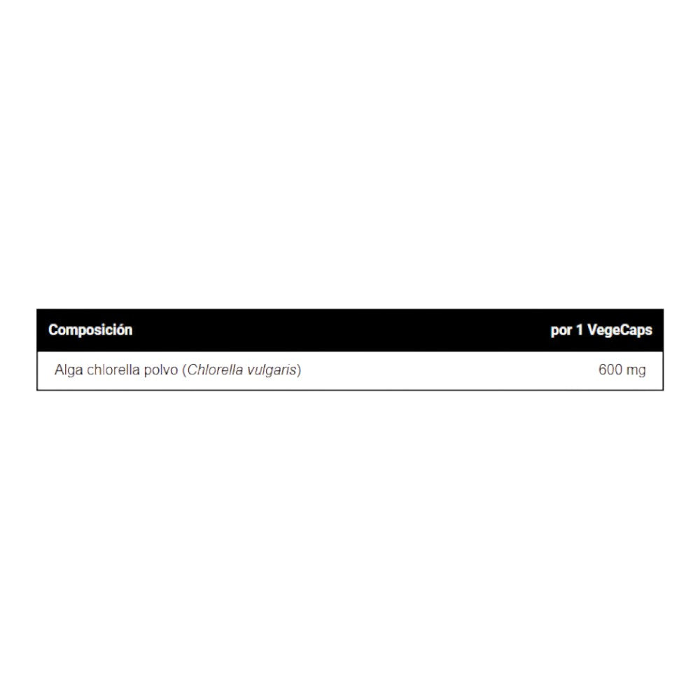 Alga chlorella polvo (Chlorella vulgaris), espesante (cápsula): hidroxipropilmetilcelulosa, agente de carga: carbonato cálcico y antiaglomerante: estearato de magnesio.