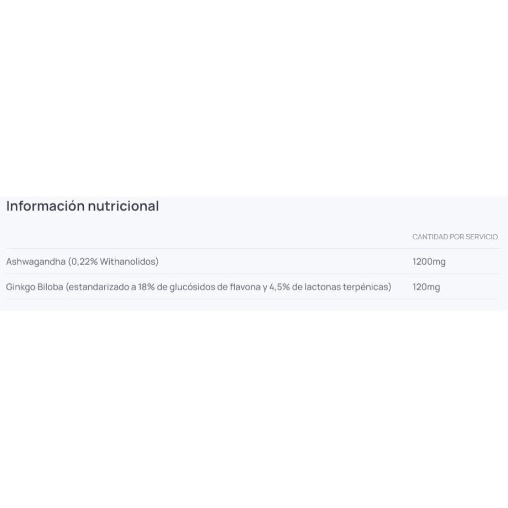 Ashwagandha orgánica (extracto seco 0,22% withanólidos), Ginkgo biloba (extracto seco 18% ginkgoflavonglicólicos / 4,5% terpenos), cápsula vegetal, maltodextrina, antiaglomerante (sales magnésicas de ácidos grasos).