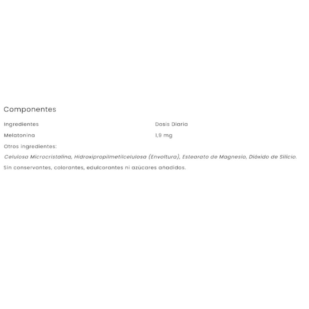 Celulosa microcristalina, hidroxipropilmetilcelulosa, estearato de magnesio, dióxido de silicio, melatonina (1,9 mg por cápsula).