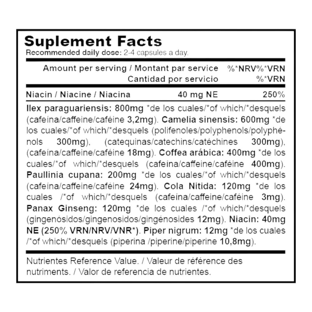 Hierba mate extracto seco (ilex paraguariensis), planta polvo (0,4% mateína), hojas, camelia sinensis extracto seco (50% polifenoles 50% catequínas 3% cafeína) hojas, clffea arabica extracto seco (10% gingenosidos) rizoma, paulinia cupana extracto seco (12% cafeína), semillas, cola nitida extracto seco (2,5 cafeína), semillas, ànax ginsegn extracto seco (10% gingenosidios) rizoma, vitamina B3 (nicotinamida), pimienta negra, extracto seco (90% piperina) frutos, excipientes: maltodextrina, celulosa microcristalina, estearato de magnesio, dióxido de silicio.