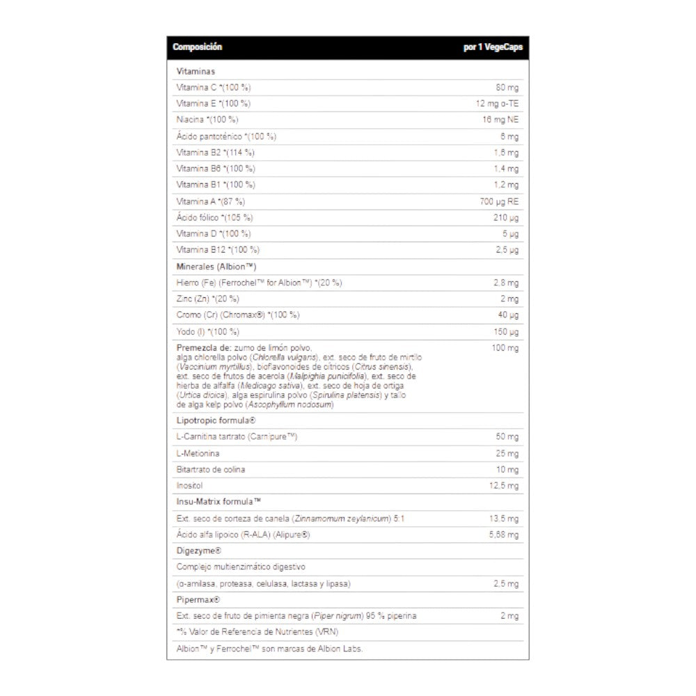 Calcio bisglicinato, Oxxynea® (mezcla de extractos de uvas rojas y blancas, naranja, pomelo, arándano, papaya, piña, fresa, manzana, albaricoque, cereza, grosella negra, tomate, zanahoria, té verde, brocoli, repollo, cebolla, ajo, oliva, germen de trigo (gluten), pepino y espárrago), espesante (cápsula): gelatina, L-Carnitina tartrato, ácido ascórbico (vitamina C), magnesio bisglicinato, hierro bisglicinato, harina de arroz, zinc sulfato, L-Metionina, colina bitartrato, antiaglomerante: estearato de magnesio, acetato de D-Alfa-Tocoferilo (vitamina E), niacina (ácido nicotínico), canela ext. seco (Cinnamomum zeylanicum), inositol, retinol (vitamina A), D-Pantotenato cálcico (ácido pantoténico), ácido alfa-lipoico (R-ALA), DigeZyme® (mezcla de enzimas amilasa, proteasa neutra, celulasa, beta-D-Galactosidasa y lipasa), cianocobalamina (vitamina B12), antiaglomerante: dióxido de silicio, pimienta negra ext. seco (Piper nigrum) 95 % piperina, colecalciferol (vitamina D3), riboflavina (vitamina B2), piridoxina HCl (vitamina B6), tiamina clorhidrato (vitamina B1), cromo picolinato, ácido fólico (vitamina B9) y yoduro potásico.