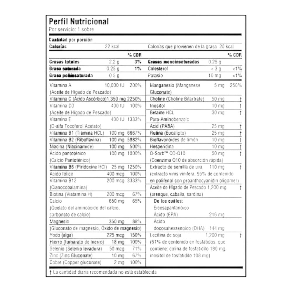 El contenido de cada pack debe tomarse preferiblemente con la comida principal del día para maximizar la absorción de las vitaminas liposolubles (A, D, E, K) y reducir cualquier posible molestia estomacal. Es un complejo potente, por lo que no se recomienda exceder la dosis diaria indicada.