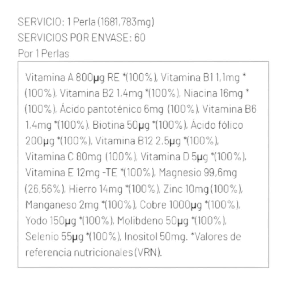 Su formulación incluye Vitamina A, Betacaroteno, Vitamina D3, Vitamina K, Vitamina B1, Vitamina B2, Vitamina B6, Vitamina B12, Vitamina B3, Vitamina B9, (ácido fólico), Vitamina B5, Biotina, Vitamina E, Vitamina C, Cloruro Potásico, Zinc oxido, Fumarato ferroso, Gluconato de manganeso, Gluconato de cobre, Yoduro potásico, Picolinato de cromo, Selenito de sodio y Fosfato de Magnesio.