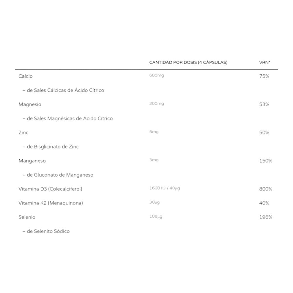 Sales cálcicas de ácido cítrico(1) , Sales magnésicas de ácido cítrico(1) , Agente de recubrimiento (hidroxipropilmetilcelulosa)(1) , Bisglicinato de zinc(1) , Gluconato de manganeso(1) , Vitamina D3 (colecalciferol)(1) , Vitamina K2 (menaquinona)(1) y Selenito de Sodio(1) .