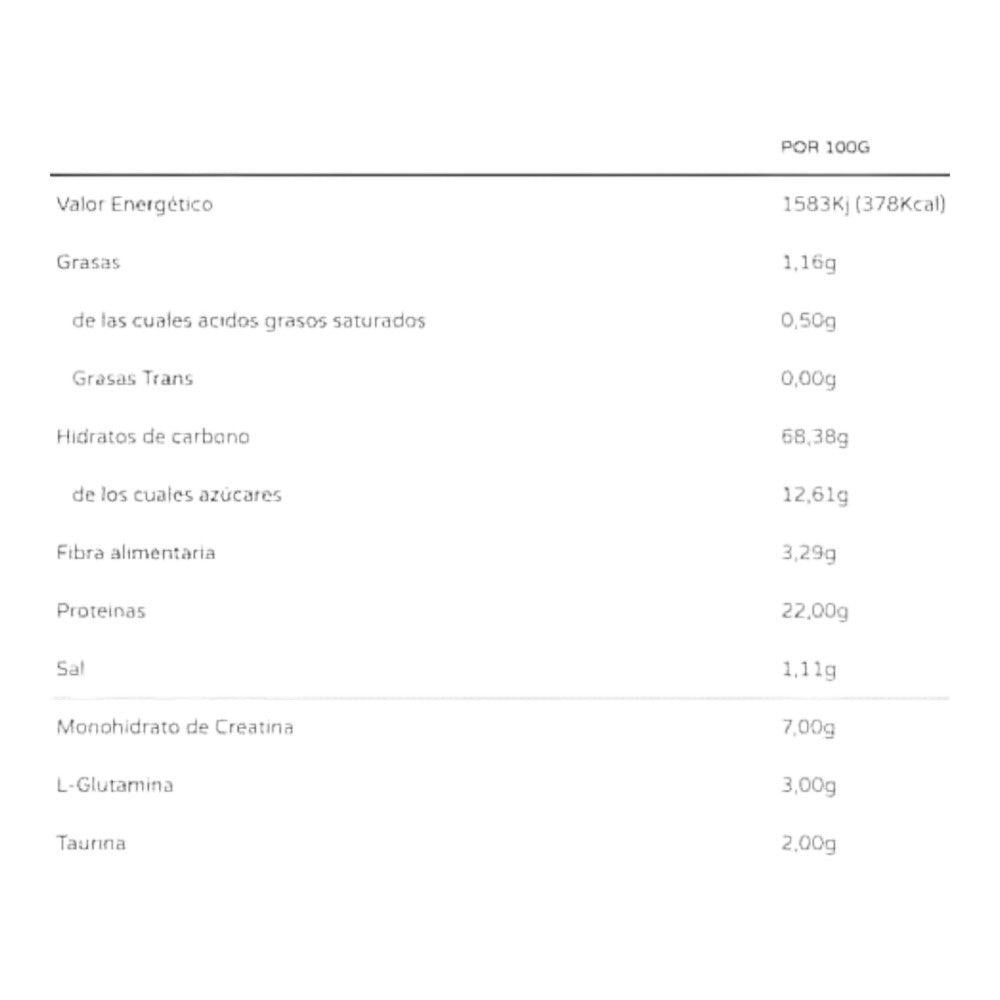 Complejo de Mezcla de Carbohidratos (Maltodextrina, Almidón De Maíz, Dextrosa, Fructosa, Inulina), Concentrado de Proteína de Suero (leche, lecitina de soja), Monohidrato de Creatina, L-Glutamina, Taurina, Cacao en polvo bajo en grasa, Aroma, Cloruro de Sodio, Espesantes (Goma xantana, Goma guar), MCT (Triglicérido de Cadena Media) en polvo, Cloruro de Potasio, Edulcorantes (Sucralosa (E955), Glucósidos de Esteviol (E960a)), Óxido de Magnesio, Carbonato de Calcio, Clorhidrato de Piridoxina (Vitamina B6), Colecalciferol (Vitamina D), Cianocobalamina (Vitamina B12).