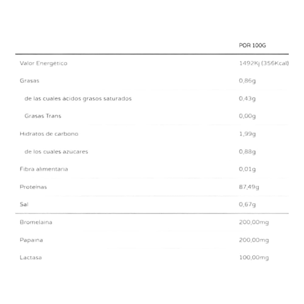 Fórmula complementada con una matriz de enzimas digestivas, Bromelina y Papaina como enzimas proteolíticas para mejorar la digestión y asimilación de la proteína, y lactasa para mejorar la digestión de la lactosa, convirtiéndose así en la proteína de mejor digestión y asimilación del mercado.