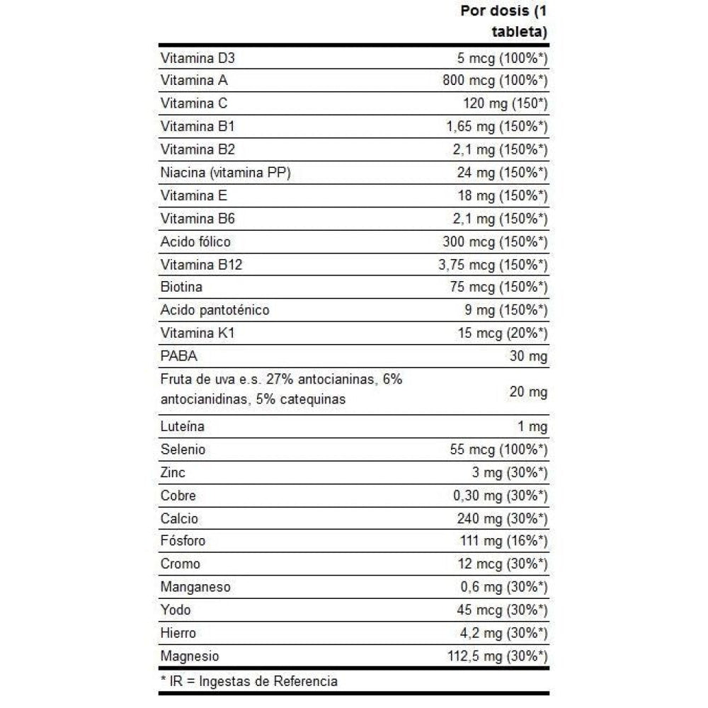 Fosfato de calcio dibásico; estabilizador: celulosa microcristalina; óxido de magnesio ; ácido ascórbico (vitamina C); gluconato de hierro; ácido para-aminobenzóico (PABA); gluconato de zinc; levadura de selenio; nicotinamida (niacina); gluconato de zinc; uva (Vitis vinifera, frutas) extracto seco titulado 27% antocianidinas, 6% antocianinas, 5% catequinas (Vitis Biocomplex)*; luteína de Caléndula officinalis; acetato de dl-alfa-tocoferol (vitamina E); agentes de recubrimiento: ácido hidroxipropilmetilcelulosa, esteárico; agentes antiplaquetarios: dióxido de silicio y estearato de magnesio; calcio D-pantotenato (ácido pantoténico); gluconato de manganeso; fluoruro de sodio; gluconato de cobre; riboflavina (vitamina B2); clorhidrato de piridoxina (vitamina B6); clorhidrato de tiamina (vitamina B1); acetato de retinilo (vitamina A); ácido pteroilmonoglutámico (ácido fólico); picolinato de cromo; D-biotina; yoduro de potasio; fitomenadiona (vitamina K1); colecalciferol (vitamina D3); cianocobalamina (vitamina B12).