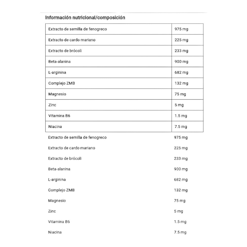Extracto de semilla de fenogreco, beta alanina, L-arginina hidroclorido, extracto de brocolí, extracto de cardo mariano, Complejo ZMB (óxido de magnesio, óxido de zinc, clorhidrato de piridoxina), niacina.