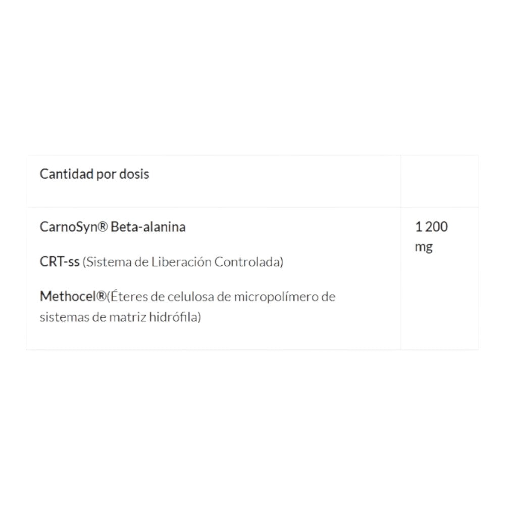 beta-alanina (CarnoSyn®) 1200 mg, cápsula de gelatina (a base de gelatina pura, agua,), estabilizante: hidroxipropil metilcelulosa (Methocel®) antiaglomerante: estearato de magnesio, dióxido de silicio.