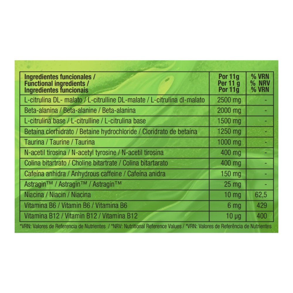 - N-acetil tirosina: Aminoácido L-tirosina en forma altamente bioactiva, que actúa como precursor de la dopamina y más abajo en la cadena precursora epinefrina y norepinefrina. Gracias al aumento de estos neurotransmisores se ve potenciada la motivación, concentración y energía.