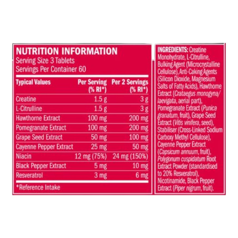 Monohidrato de creatina, L-citrulina, agente de carga (celulosa microcristalina) agente anti-apelmazante (dioxido de silicio, sales de magnesio de ácidos grasos), extracto de Hawthorne (espino blanco) (1% de flavonoides, 3% de proantiocianidinas oligoméricas), extracto de granada (punica granatum, fruta), extracto de semilla de uva (85% polifenoles), extracto de pimienta cayena (capsicum annum, fruto), extracto de polvo de raíz de polygonum cuspidatum (estandarizado para un 20% de resveratrol), nicotinamida, extracto de pimienta negra (piper nigrum, fruto).