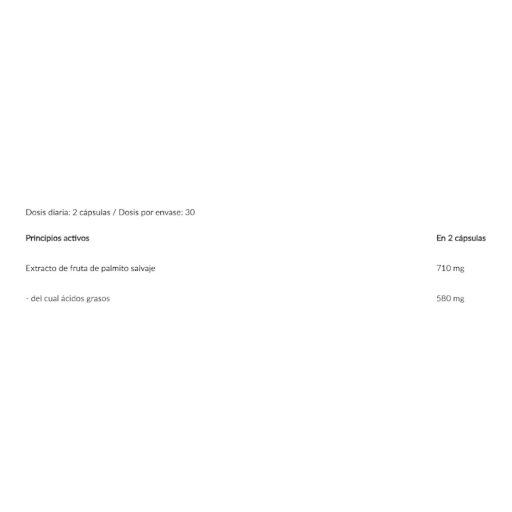 Extracto de fruta de palmito salvaje (Serenoa repens) 70%, cubierta de la cápsula [gelatina, agente de recubrimiento (goma laca), colorante (óxidos e hidróxidos de hierro), correctores de la acidez (hidróxido de amonio, hidróxido de potasio)], agente de carga (óxido de magnesio), antiaglomerantes (sales magnésicas de ácidos grasos, dióxido de silicio).