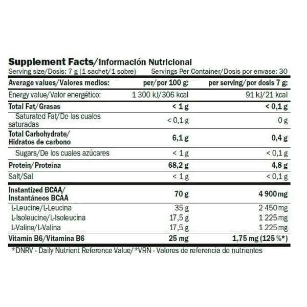 L-leucina instantánea, L-isoleucina instantánea, L-Valina instantánea, reguladores de la acidez: ácido cítrico, ácido málico, citrato de sodio; espesante: goma de xantano; aroma, edulcorantes: sucralosa, acesulfamo-K; antiaglutinante: dióxido de silicio; emulsionante: lecitina de soja; colorantes: (piña sabor: curcumina; sandía sabor: clorofilina de cobre); piridoxina HCl (vitamina B6).