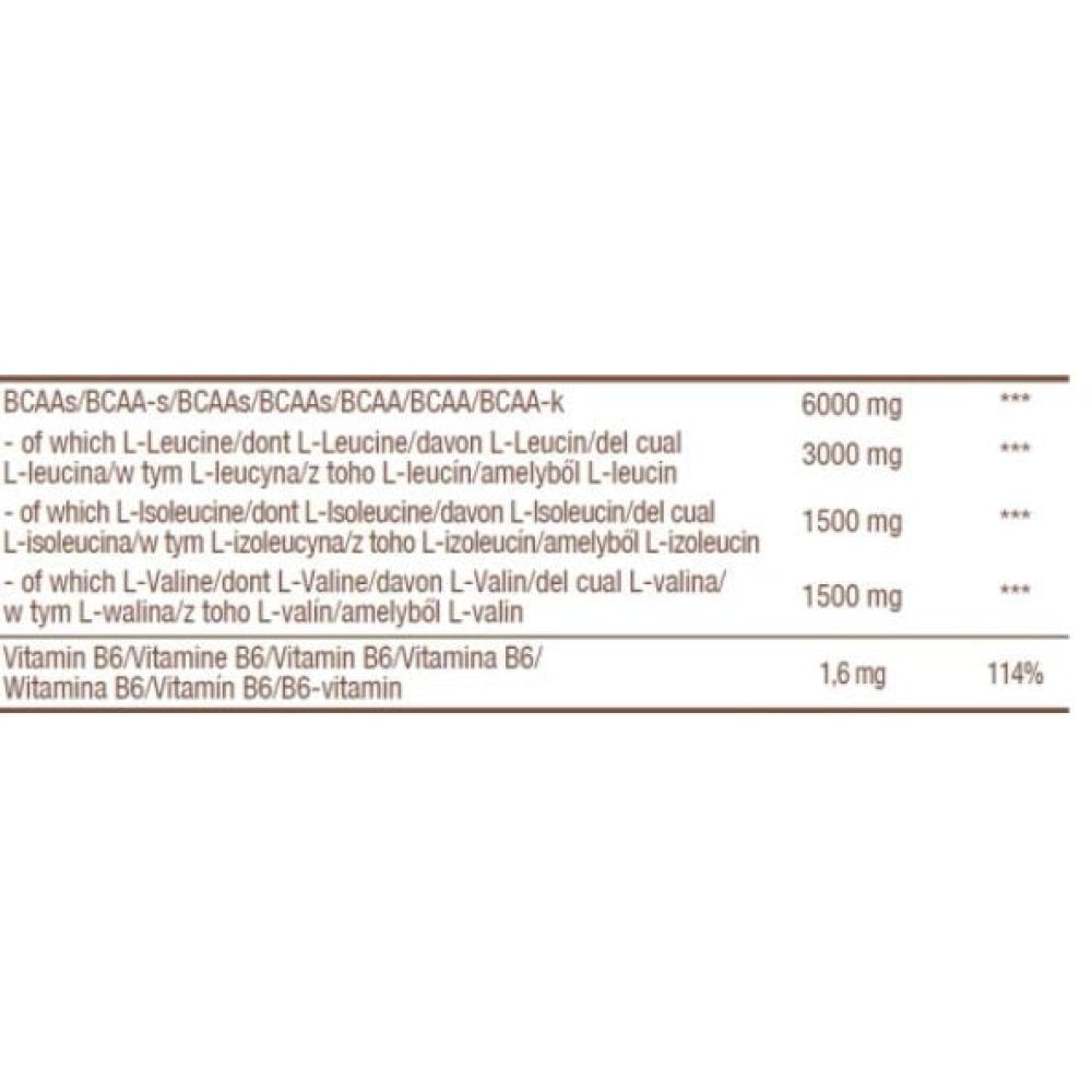Sabor limón: 33% L-leucina instantánea (L-leucina, emulgente: lecitinas), 17% L-isoleucina, 17% L-valina, inulina, aromas, acidulante (ácido cítrico), cáscara de limón en polvo, antiaglomerante (dióxido de silicio), edulcorante (sucralosa), sal, clorhidrato de piridoxina.